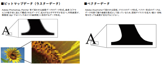 ビットマップデータ(bitmap date) ビットマップデータとは、Photoshopの画像データ等のことで、ピクセル(点)の集合体として画像データを保持しています。 一般的に写真のような画像データは、ビットマップで構成されていることが多く、拡大や変形をすると画像が荒れてしまう性質があります。