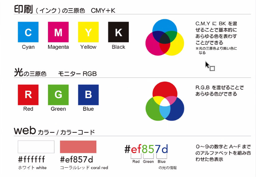 PCのモニターやデジカメ、スキャナなどは、このRGBカラーで色が表現されています。これらは混ぜれば混ぜるほど色が明るくなり、白色に近づいていくため『加法混色』と言われています。